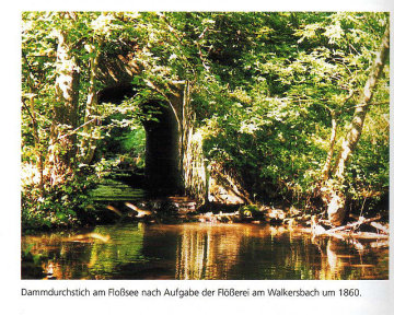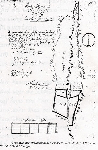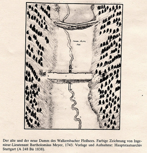 Vom Floßsee in Walkersbach wissen wir, dass er 1742 durch Forstmeister von Grassenberg aus Schorndorf aus einem älteren Teich unter Beihilfe des Oberschiffers Vollmar aus Pforzheim durch vollständigen Umbau größer erstellt wurde. Ausgeführt hat die Baumaßnahme der Seegräber Vogel aus Böblingen. Der Damm wurde nun 304 Fuß lang, an seiner höchsten Stelle 30 Fuß (8,6 m) hoch und 75 Fuß (21,5 m) unten bzw. 20 Fuß (5,7 m) oben breit. Er fasste damit soviel Wasser, dass dieser für 2 – 3 Tage Flößerei ausreichte. Wann der ältere Teich entstanden war, ist nicht bekannt.